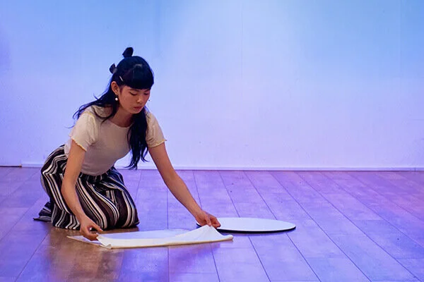 Ok so first we’re going through all this paper which is crumpled on the floor. We report these findings on the megaphone: petrol, elvine, midland, fire, plasma… what’s that? oh dear now there are dandelions over our eyes. Yes this will exacerbate the hay fever. In reverse. Hold on now just checking something. Yes just checking our wristwatch you see. Ah no, turns out we’ve something scrawled on our arm..? (Silence). Now we’re garglin’, now it’s lemon chili ginger, the ol’ shapelessness of the mind, DE-crumpling of the paper and…